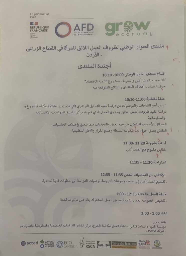 شارك رئيس منظمة أمان لتنمية المجتمع المدني في منتدى الحوار الوطني حول ظروف العمل اللائق للمرأة في القطاع الزراعي في الأردن، والذي عقدته جمعية العون والتعاون التقني (ACTED) اليوم الأربعاء.